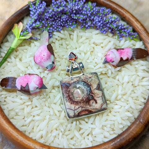 Sterling Silver Birds Eye Rhyolite & Garnet Pendant~JSSBERP4. Birdseye Rhyolite (also called Birdseye Jasper). Rhyolite was named "streaming rock" because of its beautiful bands, bubbles and crystal-rich layers that form as lava flows onto the surface of the stone. It can look very different, depending on how that lava erupts. It aids in communication and brings in the clarity to what is being said. It helps the individual to understand the bigger picture. It is a stone of protection and regeneration. It shows us how to enjoy the immense potential within ourselves. It helps narrow your focus to what's really important; following your bliss, it reminds us that achieving a state of bliss is about perspective-you are what you think about, considered a stone of creativity at our deepest level, bringing our limitless potential and talents to the surface. It is thought to bring comfort, clarity, and protection during the process of resolving past issues. It is said to help us remain grounded and rooted in meditative practices. Garnet is a stone of health & commitment, removes negative energy from the chakras, controls anger, especially at oneself, enhances sexuality, helpful when one feels abandoned..reminding us that the Earth Mother will provide all our needs, brings courage & hope, great manifestation stone. 38mm x 24mm x 7mm
