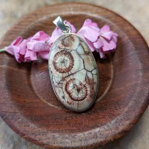 Sterling Silver Birds Eye Rhyolite Pendant~JSSBERP2. Birdseye Rhyolite (also called Birdseye Jasper). Rhyolite was named "streaming rock" because of its beautiful bands, bubbles and crystal-rich layers that form as lava flows onto the surface of the stone. It can look very different, depending on how that lava erupts. It aids in communication and brings in the clarity to what is being said. It helps the individual to understand the bigger picture. It is a stone of protection and regeneration. It shows us how to enjoy the immense potential within ourselves. It helps narrow your focus to what's really important; following your bliss, it reminds us that achieving a state of bliss is about perspective-you are what you think about, considered a stone of creativity at our deepest level, bringing our limitless potential and talents to the surface. It is thought to bring comfort, clarity, and protection during the process of resolving past issues. It is said to help us remain grounded and rooted in meditative practices. 47mm x 22mm x 8mm