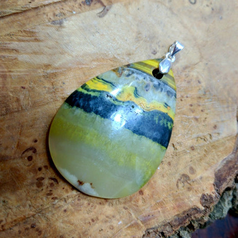 Sterling Silver Eclipse Stone Pendant, also known as Bumblebee Jasper (not a true jasper) is an earth energy stone, within the strong energy of the volcano from which it was born. It is said to help one find new opportunities, increase your self-esteem and help make decisions without relying on emotions. It enhances your creativity and gives one confidence. It is said to assist the impossible to manifest, and can be used to remove obstacles to self-realization. It is thought to bring together the four directions (North, East, South, West) Mother Earth and Father Sky, and can be used as an offering to the four directions so that light and purity will be restored to the Earth. 57mm x 34mm x 7mm