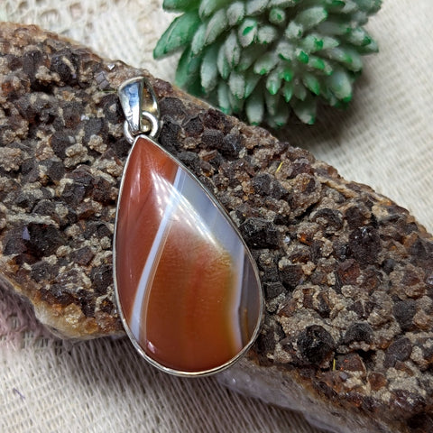 Sterling Silver Carnelian Pendant~JSSCARN2. Carnelian stimulates analytical capabilities and precision, enhances perceptiveness to situations and awakens ones talents. It is also used to produce inspiration from, and connected-ness with, the spiritual worlds. It protects against envy, fear, and rage, and helps banish sorrow from the emotional structure. Carnelian is said to remove fear of death, bringing an acceptance of the life cycle. It provides an energy conducive to the stabilization of energy in the home, and strengthens the bonds of love between parent and child. The message of carnelian is that since one IS love, there is nothing to do but offer the love. It stimulates inquisitiveness and dispels apathy and passivity. It reminds us of the balance between connecting with the Divine and actually taking action on the guidance and inspiration we have received, we must take initiative and signal the universe by our actions that we are truly prepared to do what it takes to achieve our dreams, that we are co-creators with the Divine. Say to yourself "I am willing to create my reality". 45mm X 20mm X 6mm