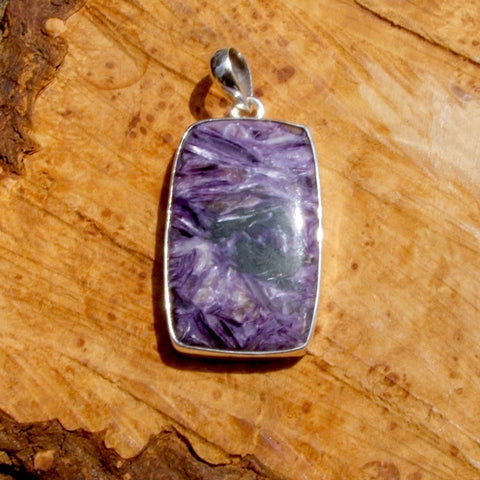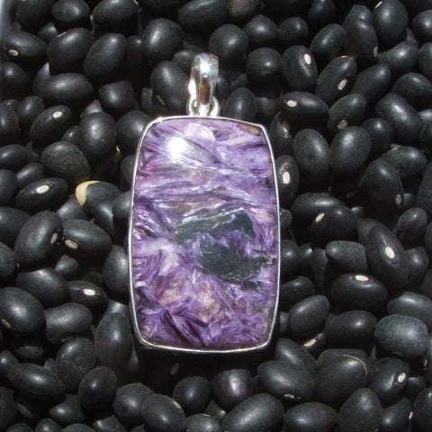 Sterling Silver Charoite Pendant- JCH0005 53mm x 25mm x 7mm. Charoite is a secondary stone of Namaste' (primary being Prasiolite) facilitating the acceptance of others just as they are in each moment. It is grounding and transmutes negative energy. It is said to help release self-sabotage, feelings of worry, separation, anger, outdated patterns and the programming instilled by others. Stone size 35mm x 22mm.