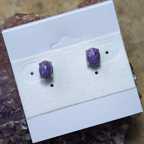 Sterling Silver Charoite Post Earrings~JSSCEAR1. Charoite is a secondary stone of Namaste' (primary being Prasiolite) facilitating the acceptance of others just as they are in each moment. It is grounding and transmutes negative energy. It is said to help release self-sabotage, feelings of worry, separation, anger, outdated patterns and the programming instilled by others. 8mm x 6mm