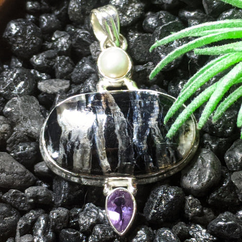Sterling Silver Chrysotile Shale Pendant~JSSCSP03. Chrysotile Shale can be used to bring a bonding action between one and the subject of one’s desires, such that one may easily release the object whenever the need has been fulfilled. It brings an energy of resourcefulness and integrity and serves to instill honesty and sincerity. It assists one in “finding” the “true” self by clearing the “baggage”of the past and by recognizing ones individual controlling modes. It assists one in the release of control over others, especially as a trauma response, and assists one in maintaining control with respect to ones life. It is an ally when triggered “fight or flight” responses take over, and can assist calming of an accompanying “agitated emotional state.. It assists in breaking down defensive walls when safe to do so, and to release old hurts and negative feelings, while helping one find a way to respond positively to new situations. It has been used in telepathic endeavors to both send and to receive messages, assisting one in assuring delivery and acceptance of the information. 43mm x 18mm x 6mm
