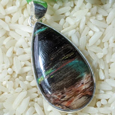 Sterling silver Copper Petrified Wood Pendant~JSSCPWP2. Copper Petrified Wood is a new find of Petrified Wood. Petrified Wood is wood that has been naturally replaced by silica (quartz) over time, ofter retaining all the original detail of the wood. These specimens were located near copper deposits that colored the silica with various copper minerals…Chrysocolla, Malachite, Cuprite, Azurite or others. Copper Petrified Wood can help one connect to, and learn the patience of, the Ancient ones,Elders and Ents. It helps one remain grounded during trying times. It assists one in accessing past-life information, and the exploration of information from different "chapters" of this current life. It grants one the perseverance to strive and grow individually while part of a community, and assists one in one's personal evolution during periods of change. Copper is the metal of channeling energies. It has the ability to ground and transfer a wide array of vibrational frequencies from the spiritual to the physical. It is a conduit between Heaven and Earth, and it performs the essential task of providing the medium for manifestation of the invisible to the visible. It encourages experimentation and invention. It encourages learning through receptive observation. Copper carries the energy of the wise Grandmother who has learned much from life but will only share her knowledge when you are patient, respectful and attentive. It can help one become more aware of the unconscious inner dialog that often creates our emotional experience. Copper can combat lethargy, passivity, restlessness, excitability, and non-acceptance of oneself. It can stimulate initiative, optimism, diplomacy, and independence. It conveys the message that there is no need to seek love or to constantly search for life, and that there is a need to seek and release all of the restrictions which one has installed within the self. It activates and opens the base and sacral chakras, advancing and stabilizing the energies of intuition, sexuality, desire and vitality. 44mm x 20mm x 6mm
