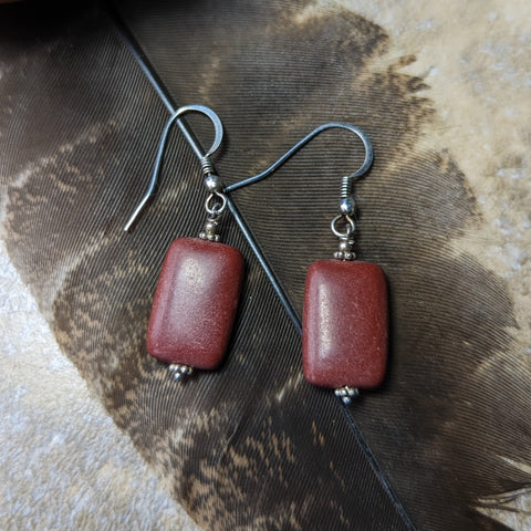 Sterling SIlver Pipestone Earrings~JSSPIPES. Pipestone (catlinite) quarries are considered a sacred site by many American Indians. For the last 3000 years, tribes across the central region of North America have traveled to this site to quarry. Pipestone was used for making Native American pipes used for prayer, and the scraps have been carved into Fetishes (animal carvings) and for jewelry. Black Elk said “When you pray with this pipe, you pray for and with everything.” The task of extracting pipestone from the earth is a slow and labor intensive process and the hand tools used today are not much more advanced than the tools and methods used in centuries past. The layer of pipestone is sandwiched between layers of very hard Sioux Quartzite rock. 40mm Long. Bead size 18mm Long x 12mm wide.