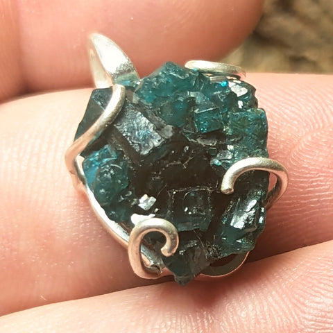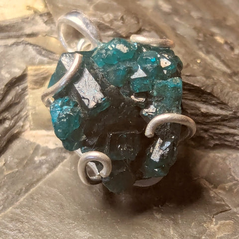 Sterling Silver Dioptase Pendant~JDIOPP02. Dioptase is the stone of the High Heart Chakra (between our heart and throat chakras), the seat of unconditional love and our immune system. It is a very high vibration mineral. It is said to heal karmic family patterns, the source of much dis-ease. It reminds one that "there is only here, there is only now", to live in the moment. As a stone of intimacy (or into-me-see), it grants us the courage to bond and grow in relationship, and the honesty to know when it is time to grow in a different direction. It is excellent for healing emotional pain, and is considered a stone of the deepest healing! It is said to help heal dis-ease brought on by any form of abuse. It stimulates absent forgiveness, helps one release attachment to karmic debts, karmic contracts that impact relationships, and helps one detach from unhealthy family dynamics. Because of this energy, it resonates with both the practices of Ho’oponopono and Family Constellation work. 26mm x 17mm x 14mm.