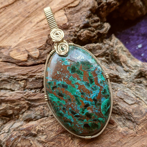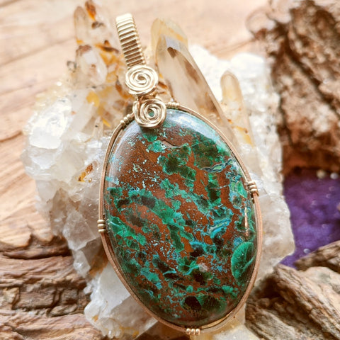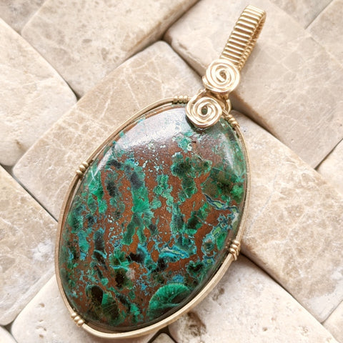 Gold-Filled Wire Wrapped Eilat Stone Pendant~JSSEILP1. Eilat Stone is a copper based stone that is made up of a mixture of many of the well-known copper based minerals, including Azurite, Chrysocolla, Turquoise and Malachite as well as some other less well known minerals. It was first found, in the Sinai Peninsula in Israel, near a place called Eilat, and is the national stone of Israel. It is known as the “King Solomon stone”, as the mines were under his control. King Solomon valued is as highly as gold, and created jewelry for the Queen of Sheba from both. It is also known as the “stone of the sage”, promoting wisdom and problem solving. It has been used in wedding ceremonies for “sacred marriages”, ones based upon the heart and soul. It is a stone of “regality and dignity. It assists one in recognizing the birthright of freedom, and futhers ones knowledge of ancient cultures. It is a nurturing stone that can assist in the removal of negativity and negative persons from ones environment. 65mm x 33mm x 7mm