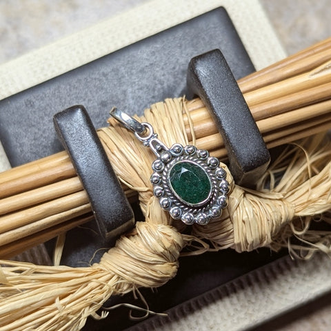 Sterling Silver Emerald Pendant~JSSEPDT2. Emerald is the stone which most purely represents the energy patterns of the activated heart chakra. It helps one to live and act from the heart level, offering unconditional love and compassion in one’s daily life and relationships, opening one to receive love from others and clearing the channel for one’s own connection with Divine Love. It can help one to heal “heartbreak”, and to remember to give love to oneself as well as others. An open heart allows the cornucopia of universal blessings to flow into one’s life, and this is why emerald is know as a stone of prosperity. Abundance describes one’s ability to receive the gifts of Spirit within all life’s experiences. It is a sense of opening one’s life to the Divine and embracing all its manifestations with gratitude. True abundance is knowing that all is provided and that there can be no lack in reality. It helps one move forward on the path “with heart”. It brings an energy of hope, encouragement, gentleness and abundance. It brings a freshness and vitality to the emotional and physical heart. Emerald encourages one to trust the Divine in ALL things and to surrender one’s personal version of what reality “should be”. 31mm x 15mm x 5mm
