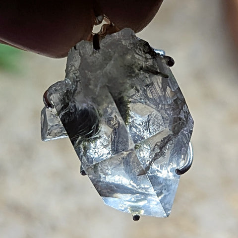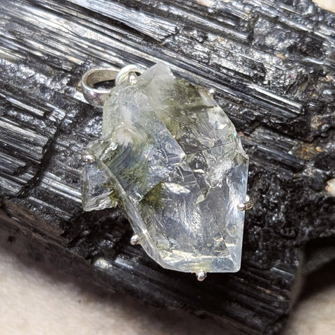 Epidote in Quartz Pendant~JSSEQP01. The meaning of Epidote’s name comes from the Greek word for ‘increase’. Epidote is an attraction stone, so it will manifest that which matches whatever you choose to emanate. If you are loving and romantic, it will attract more love and romance to you. It will enhance the energy of whatever it touches, including other stones. It increases perception and interaction with spiritual beings, and brings spiritual growth. It is a great stone for releasing negativity and raising one's vibrational energy. It is helpful for those stuck in modes of depression, hopelessness, or other negative thinking pattern. It can inject a sense of hopeful optimism into one's emotional body, helping to bring the mind into a higher vibration. Crystal healers like to work with it for its ability to clear congestion and energy blockages in the physical and subtle bodies. It will help to balance and stabilize the energy flow in the body. Epidote is an excellent stone for attunement with nature and her healing qualities. It puts forth a simple, calming, grounding, back to Earth vibration, which is particularly good for those living in a high energy, city setting. It’s also a very powerful dream stone that will give you lucid dreams and very restful sleep. It will help you remember your dreams so that you can apply their messages to your life. Quartz is an energy amplifier, said to bring the energy of the stars into the soul. It is considered a stone of harmony, and is thought to facilitate communication with spiritual and other-worldly masters, teachers, & healers. Quartz can be programmed as a constant prayer or intent generator. 40mm x 25mm x 18mm
