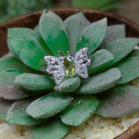 Adustable Stainless Steel Faceted Yellow Tourmaline Butterfly Ring~JSTYTBFR. Adjustable from size 5 to 8. Note your size in notes during checkout and we will pre-size, you can fine tune. Butterflies are deep and powerful representations of life. Many cultures associate the butterfly with our souls. The Christian religion sees the butterfly as a symbol of resurrection. Around the world, people view the butterfly as representing endurance, change, hope, and life. Yellow Tourmaline helps one release the need to control ones own or others lives. It helps one recognize that the need for control equals a lack of trust in the Divine. It clears the solar plexus chakra freeing one to reclaim ones power and be more confident and manifest more easily. It is also useful for healers and empaths due to its ability to protect one from absorbing the emotional energies of others through the third chakra. One (1) Yellow Tourmaline Butterfly Ring.