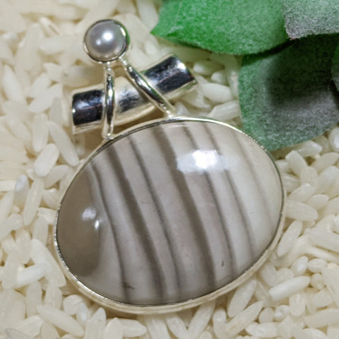 Sterling Silver Flint (Madagascar) & Pearl Pendant~JSSFLNT3. Flint is an excellent choice for use in activities related to thought transference; one may transfer information, ideas, and loving emotional messages to another AND receive, in return, the touching interpersonal experiences of the energy of the universe. It can help to relieve shyness, and to promote both intimate and personal experiences. It also assists one in severing the emotional ties through which one is attached to problems and distressful situations. It has been revered by the ancient tribes to produce protective energy and to dispel negativity from “haunted” localities. It assists one in viewing the unknown, providing for insight into the methods by which to oppose contrary forces. Pearl signifies faith, charity, and innocence. It is said to enhance personal integrity and increase ones ability to focus. It also symbolizes purity and can stimulate that condition in both ones mind and body; hence, providing a clear vehicle for the advancing states of wisdom, as well as a clean channel for receipt of spiritual guidance. It is known as a “stone of sincerity”, bringing truth to situations and loyalty to a “cause”. 37mm x 29mm x 9mm