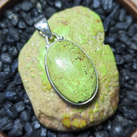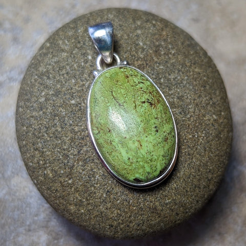 Sterling Silver Gaspeite Pendant~JSSGASP2. Gaspeite’s energy is about bringing the spiritual realms into expression in everyday life. It is also about expanding awareness so that one can more readily discern the presence of the spiritual in the "mundane world". It allows one to "walk the walk" without allowing old habits or patterns to take over. It helps one notice the many small synchronicities that are offered as guidance and promptings from the Universe. . When one’s eyes are opened and one’s awareness sharpened, one notices little "coincidences" one would likely have overlooked before, and these events become more frequent when one gives attention to them. It is a proof of the saying of Jesus, "Seek and ye shall find". It helps seekers to realize that the answers to their most burning questions are spread out all about their feet. This gift of vision can bring one great joy. It blends the energies of the heart and solar plexus, yet it does so in a more grounded, physical way. It promotes the health of the heart and digestive system. It can help those with poor appetites to enjoy food, and to eat the proper foods at the right times. It helps one to inwardly "hear" what sorts of foods the body and soul need and desire. It can support long term weight loss due to its ability to regulate blood sugar, improve insulin function and decrease stress-related hormones that may contribute to weight gain. It is also excellent for those who are holding onto excess "weight" in the form of possessions and "stuff" that need to be released before one can move on. It is excellent for awakening and healing the inner child within oneself. Often one feels exhausted and stressed by life without really knowing why, but one’s inner child most certainly knows. It can bring one’s unconscious wounds and attachments to the surface for healing and release. Gifting one’s inner child with gaspeite is one way of showing the self-love which allows this neglected part of oneself to step out of the shadows. It assists one in integrating spirit into the body and can be very helpful for those who resist being in physical form , or who need assistance in being present in the physical form. 38mm x 19mm x 8mm