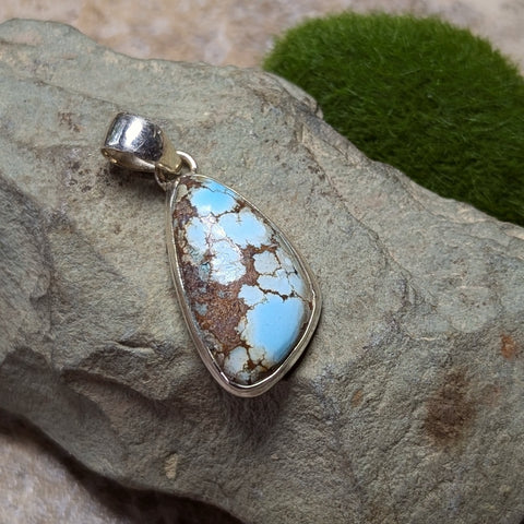 Sterling Silver Golden Hills Turquoise Pendant~JSSGHTQ1. Golden Hills Turquoise is a new and prized Turquoise from Kazakhstan that can only be mined two months out of the year due to weather and rugged terrain. Turquoise is a stone for finding wholeness and truth, and an aid in the communication and manifestation of those qualities. It can enhance one's ability to perceive the disparate aspects of self and to integrate those aspects into a cohesive whole. Wearing turquoise can empower those who are shy about sharing their understanding , and it can help one realize that, in speaking from the wholeness of our being, we each have something important to contribute to the collective. Turquoise counsels us that all experiences are valid and that mistakes are simply another experience. It reminds us that wholeness can come only when we are willing to embrace the totality of who we are and what we have learned on our Earth walk. It is also beneficial to overall well-being and soundness of one's moods and emotions. It is balancing and induces a sense of serenity and peace. It teaches the wisdom of compassion and forgiveness and offers one the opportunity to experience the insight that enlightened selfishness is identical with kindness and generosity. What one wishes for oneself, at one's core, is happiness, love, and freedom from limitation and fear. Through it's heightening of emotional intelligence, turquoise demonstrates that when one releases one's insistence on "justice" and views others through the lens of compassion and forgiveness, one immediately receives those gifts through one's own heart. Turquoise is valuable for grounding and can help to prevent one from losing touch with the conscious mind during deep meditation. It is a healer of the spirit, providing for a soothing energy and bringing peace of mind. Turquoise is another gift from the Earth, bringing the blue of Father Sky to the Earth and melding together the energies of the heavens with the consciousness of Mother Earth. It strengthens and aligns all chakras, but primarily stimulates the throat, heart, and navel chakras, bringing communication skills to emotional issues, to creativity, an d to intuition, while allowing for the application of love in all issues. It facilitates a "no mind" meditative state. It can be used for atunement between those of the physical plane, as well as between one and the spiritual world. It is valuable to provide strength and protection during vision quests. Turquoise is a healer of the spirit, providing for a soothing energy and bringing peace of mind. It acts to induce wisdom and understanding, and to enhance trust, kindness, and the recognition of beauty, and is said to promote spontaneity in issues of romance and to stimulate the initiation of romantic love. 40mm x 17mm x 7mm