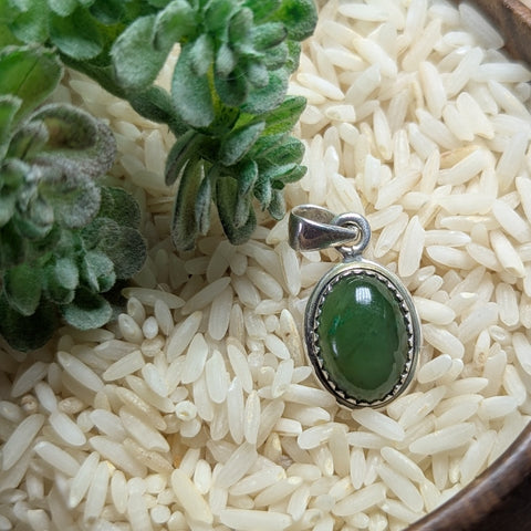 Sterling Silver Jade Pendant~JSSJADE2. Jade is considered an auspicious and sacred stone, with strong and ancient connections to Asian and Mayan cultures. It is considered by many to be a stone of prosperity, helping one access one’s full potential and commitment. It is thought to assist caregivers and hospice workers in peacefully balancing and identifying their own needs and those for who they are caring. It is also thought to assist in a gentle transition from this plane of existence to the next. It is said to assist in shamanic journeying, traveling to the spiritual realms, the underworld, the dreamtime. 28mm x 14mm x 7mm.