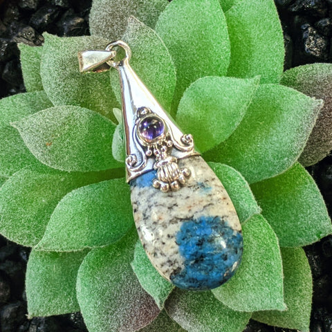 K2 Stone & Amethyst Pendant~JSSKAAZ3. "K2 Stone" is an extremely interesting rock and lapidary material from the Skardu area of northern Pakistan. It is a bright white granite that contains sharply contrasting orbs of bright blue azurite. If you examine the rock closely, you will see black flakes of biotite. It is a stone of inner vision, and is helpful for those who are studying new or challenging subjects. It facilitates an agility of mind required to make conceptual leaps and reach new insights. It can protect one from psychic attack and tendencies to succumb to fatigue. It stimulates all the mind centers, nourishing within the self a keen interest in all aspects of one’s life and function in society. It can certainly assist one in making new connections between seemingly unrelated fields of knowledge. It is a stone of synthesis, whereby the discovery of new commonalities and links between different ideas leads to higher levels of understanding of life and the world. It also gives one the ability to “read between the lines” in what others would have us believe. Azurite provides insight into the loving ways to further one’s talents. It can work very well with the sacral chakra and the heart chakra, allowing for the recognition and manifestation of the “bestower of good” within each person. It was considered a sacred stone among Native Americans and Mayans. It can be used to enable one to see the "big picture" instead of being in the mind-set to "see the puddle, when there is an ocean waiting”. It helps to banish the negative trait of skepticism, and helps one maintain balance in relationships and cooperative efforts. It is said to eliminate fear of the unknown. It opens the third eye and connection to the psychic self and the intuitive aspect of the mind. It assists during astral projections, psychic reading, remote viewing and other psychic endeavors. It is purifying to the auras and effective in healing or used in therapy rooms to stabilize healing energy fields to absorb and process healing release during healing sessions. A useful stone in dispelling fog, uncertainty and confusion and assist those who feel trapped. It allows one to look rationally at ones environment & the issues affecting ones environment, it also assists one in looking past the issue & in looking at it intelligently & with input from one’s loving side, it brings clarity by allowing one to discard insignificant & irrelevant details, a “stone of life”. Amethyst, as a stone of spiritual connection, it is said to bring peace and serenity, and transmutes and recycles the energy of lower vibration emotions like fear, anger, envy into usable energy. It is said to assist businesses to prosper. In Greek mythology amethyst was considered a "stone of sobriety". 47mm x 15mm x 9mm
