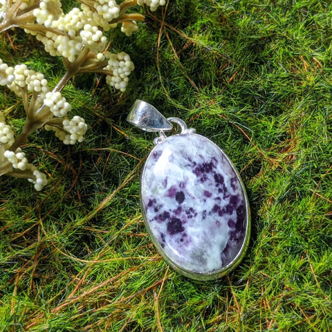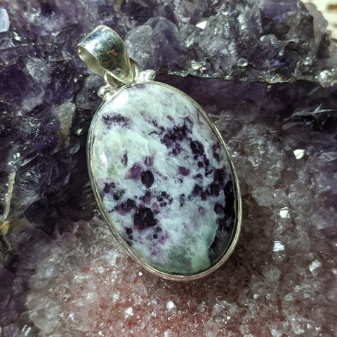 Sterling Silver Kammererite Pendant~JSSKAM02. Kammererite (RARE) is part of the Chlorite family found mainly in the Scandanavian countries of Sweden, Finland and Norway, but also in Turkey. It is a chromium based form of Clinochlore where chromium replaces the iron which is found in another form of clinochlore known as Seraphinite. Where as Chlorite/Clinochlore is considered the premier healing stone on a physical level, Kammererite is a healing stone on the Soul level, which then impacts the physical. It is a stone of spiritual development. It stimulates our third eye, crown and etheric chakras. It allows one to feel on all levels simultaneously, which makes it a fantastic divination tool. It allows us to see things from a higher, spiritual perspective allowing us to become more flexible and accepting ~ particularly if we have strong views or beliefs that were set during childhood. If we find those patterns and thoughts difficult to shift as an adult, then Kammererite is a stone that can help greatly. It sweeps through the energetic bodies, but also penetrates into the physical body. As one’s consciousness opens to these higher vibrational frequencies on is able to have a greater understanding of one’s life’s purpose. This beautiful crystal lets one ‘see’ and ‘feel’ the joy of experiencing the third dimensional reality and the opportunities it offers for one’s spiritual growth and one’s soul’s growth. This is a ‘spiritual awakening’ for many and Kammererite supports one so that one can integrate these higher vibrational frequencies into everyday living. mm x mm x mm