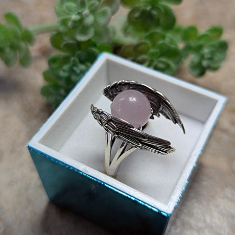 Sterling Silver Adjustable Kunzite Angel Wings Ring~JSSKZRNG. Adjustable from size 5 to 9. Note your size in notes during checkout and we will pre-size, you can fine tune. Kunzite is said to help the heart experience agape’ love, unconditional love for all sentient beings, and all beings in the plant, animal, and mineral kingdoms. It is thought to assist one in trusting the “wisdom of the heart” in leading us to the in-joyment, love, and grace of relationship with God-as-you-understand-God, and to the humbling peace and ok-ness that comes from this state of being. It is considered a stone that removes obstacles, reminding us that if God-as-you-understand-God is for us, who can be against us?