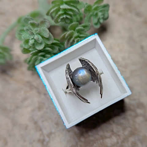Sterling Silver AdjustableLabradorite Angel Wings Ring~JSSLBRNG. Adjustable from size 5 to 9. Note your size in notes during checkout and we will pre-size, you can fine tune. Labradorite is thought to assist us and uplift us through the sometimes challenging practice of self-examination and the feelings that can accompany this exploration. It can also assist us in taking action on the guidance we receive through intuition, meditation, and prayer, leading to the understanding and fulfillment of ones destiny. It resonates with the story of Dragon and Dragonfly. One day, Dragon was challenged to prove his power by turning himself into a Dragonfly. After he did this, Dragon forgot his true power and got stuck as Dragonfly. The message of Labradorite is “Remember your magic”!