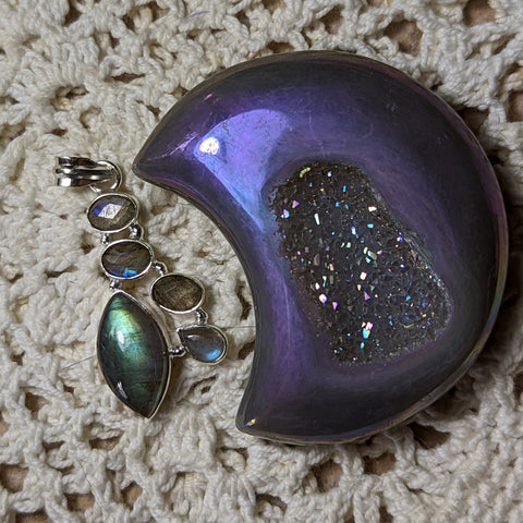 Sterling Silver Labradorite Pendant~JSSLAB15. Labradorite reminds us that thoughts create reality, and positive thinking creates positive emotional states. It is thought to connect one to extraterrestrial energies. It clears, balances, seals and balances the aura. It is said to "shine a light" of illumination on our souls destiny and avocation; to remember your magic, and encourages one to progress upon that path. It is a stone of the mental body, rationality, discernment, and intuition. 44mm x 19mm x 8mm