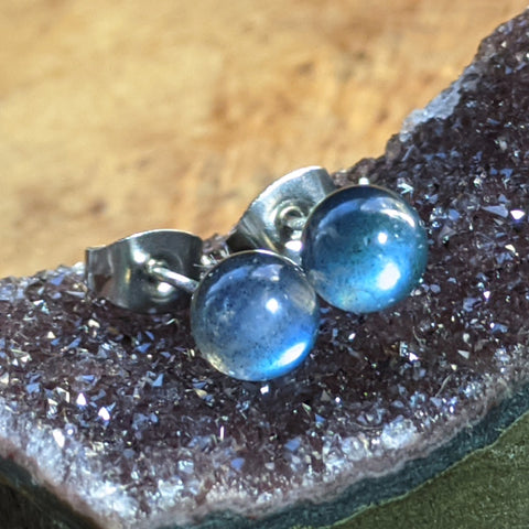 Labradorite Round Post Earrings~JSLABEAR. Labradorite reminds us that thoughts create reality, and positive thinking creates positive emotional states. It is thought to connect one to extraterrestrial energies. It clears, balances, seals and balances the aura. It is said to "shine a light" of illumination on our souls destiny and avocation; to remember your magic, and encourages one to progress upon that path. It is a stone of the mental body, rationality, discernment, and intuition. Labradorite is thought to assist us and uplift us through the sometimes challenging practice of self-examination and the feelings that can accompany this exploration. It can also assist us in taking action on the guidance we receive through intuition, meditation, and prayer, leading to the understanding and fulfillment of ones destiny. It resonates with the story of Dragon and Dragonfly. One day, Dragon was challenged to prove his power by turning himself into a Dragonfly. After he did this, Dragon forgot his true power and got stuck as Dragonfly. The message of Labradorite is “Remember your magic”! 6mm