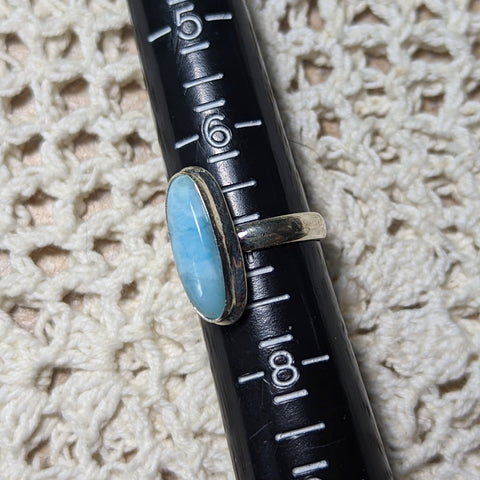 Sterling Silver Larimar Ring~JSSLRR02. Larimar~”Nurture”. The energy of Larimar is summed up by the female aspect of Spirit supporting the child within in her arms. In a sea of emotion, the child is held protectively, yet is cleansed of all impurities. This female aspect and child live within all of us, aiding us when we are in need of deep comfort and support. This is the energy of Larimar. Larimar, also known as blue pectolite or dolphin stone, ranges in color between a vibrant turquoise blue and pale green. Larimar is found in the Dominican Republic, and it reflects the colors and energies of he Caribbean Sea. Larimar is volcanic in origin, yet it exudes a nurturing cool vibration that lends itself wonderfully to tempering excess fire in one's energy. This Ally helps one to feel cradled in the arms of protection and love, while it encourages the cleansing and movement of energy throughout the body and aura. Larimar embodies the perseverance of the Water element. While fire may burn hot, it burns fast and water can always put it out. Where there is infection or any other 'hot' condition, Larimar's healing and soothing energies can be called upon to calm and cool the energies. Larimar carries the vibration of nurturing. This energy creates the sensation that one is being comforted and cared for by the Great Earth Mother. Its water energy provides the comfort of the ocean of the womb. When one is feeling the need for deep cleansing and protection, a water healing can greatly aid in recovering one's sense of connection to the Great Mother. Water healing can mean relaxing in a hot tub to sooth frazzled nerves, taking swim in the ocean, or even crying, one of the most cleansing and clearing things we can do to release "hot " energy. As adults we do not always get the nurturing and support that we need. The energy of Larimar is a wonderful Ally to call upon when the need for retreat to the womb is upon you. When Larimar is calling you, it is time to reconnect to the energies of the nurturing, female aspect of yourself and the Universe. Now is not the time for strong movement, but for retreat into the gentle flow of nature. Perhaps you have been pushing yourself too hard or too long. Maybe you just need a break from the heat of everyday life. Larimar is calling you to cool and soothe your energy. Drink some water, take a bath or have a good cry. Then curl up and dream of the blue ocean and azure sky. Listen to the frequency of Larimar in your heart, as it sings you to sleep with the voice of the Great Mother Earth. “I am supported and nurtured by the Energy of the Universe.” Size 7