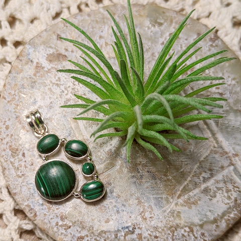 Sterling Silver Malachite Pendant~JSSMAL01. Malachite is said to be a stone of transformation, and of proper use of the will: by focusing our willpower on the solution rather than the problem, our evolution speeds up exponentially. It is said to protect one from negative energy through the law of resonance- by increasing ones positive vibration we become less likely to attract or be impacted by the negative energy or presence of others. It is thought to blend our personal power with the courage of our heart, helping one to step into and own one's power. 39mm x 23mm x 6mm