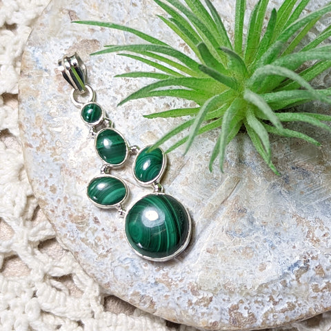 Sterling Silver Malachite Pendant~JSSMAL04. Malachite is said to be a stone of transformation, and of proper use of the will: by focusing our willpower on the solution rather than the problem, our evolution speeds up exponentially. It is said to protect one from negative energy through the law of resonance- by increasing ones positive vibration we become less likely to attract or be impacted by the negative energy or presence of others. It is thought to blend our personal power with the courage of our heart, helping one to step into and own one's power. 47mm x 18mm x 6mm