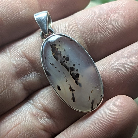 Sterling Silver Montana Agate Pendant~JSSMAG05. Montana Agates formed as a result of volcanic eruptions and massive lava flow about 60 million years ago in the Yellowstone Park area. These are no ordinary agates; they are a one-of-a-kind rock, that are located only along the banks and beds of the Yellowstone River and its tributaries (The filming locations for the movie “A River runs Through it”). The Yellowstone River is the most prominent river flowing through Southeast Montana and along its shore you can rockhound a variety of rocks such as jasper, petrified wood and quartz but the most notable find is the Montana Agate. Montana Agate is formed from chalcedony, one of the many types of quartz. Chalcedony has a waxy luster and can be semitransparent or translucent. It is found in a wide range of colors, but the colors most common are white to gray, grayish-blue or a shade of pale brown ranging to almost black. Montana Agate gets its red color from iron oxide and the black color from manganese oxide. The fern-like effects of trees, shrubs and mountain scenes come from tiny canals inside the stones that let mineral laden water seep into the stone ages ago, creating these marvelous pictures so sought after by collectors and admirers. The Montana Agate colors are uniquely displayed with moss-like, fern-like or tree-like inclusions. The most frequent colors seen in Montana Agates are, in descending order, gray, white, brown, salmon, red, orange, black and yellow. The color caused by various embedded minerals consists of iron oxides and hydroxides giving yellow, brown and red colors; copper oxide gives red, green colors; manganese oxide gives bluish and brown. It encourages perseverance and patience, and promotes a peaceful inner and outer environment. It has a strong connection to the plant kingdom and deepens our own connection to the Earth and our place in the Universe. It is a mineral of bonding, bringing others closer and activating the energies of cooperation in group efforts. It furthers a firm resolve, such that that which one starts, one completes-making the "final inch" decrease expediently and with ease. It stimulates spontaneity and grounding, enhances ones positivity and inspires true creativity. It is said to connect the conscious self and the angelic realm. Chalcedony was used as a sacred stone by the Native American Indians, promoting stability within the ceremonial activities of the tribes”. It has also been used for psychic communication, and when configured in a geode formation, can facilitate astral travel. It is thought to balance the four body energy system, physical, mental, emotional and spiritual. 43mm x 18mm x 5mm.