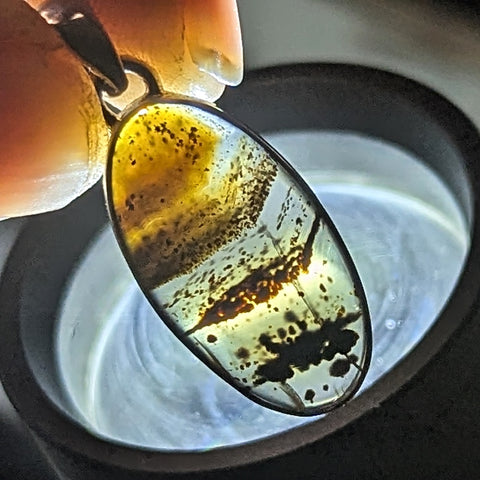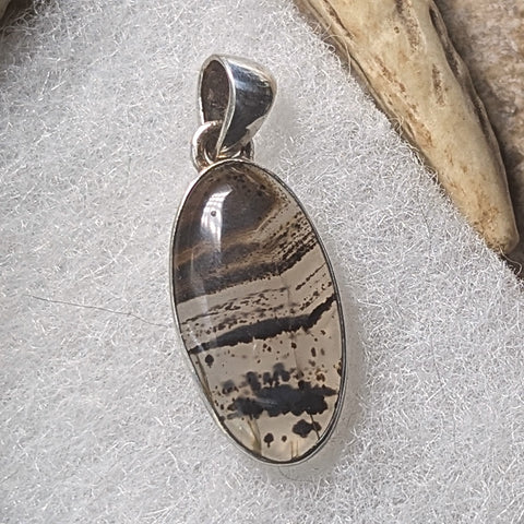 Sterling Silver Montana Agate Pendant~JSSMAG11. Montana Agates formed as a result of volcanic eruptions and massive lava flow about 60 million years ago in the Yellowstone Park area. These are no ordinary agates; they are a one-of-a-kind rock, that are located only along the banks and beds of the Yellowstone River and its tributaries (The filming locations for the movie “A River runs Through it”). The Yellowstone River is the most prominent river flowing through Southeast Montana and along its shore you can rockhound a variety of rocks such as jasper, petrified wood and quartz but the most notable find is the Montana Agate. Montana Agate is formed from chalcedony, one of the many types of quartz. Chalcedony has a waxy luster and can be semitransparent or translucent. It is found in a wide range of colors, but the colors most common are white to gray, grayish-blue or a shade of pale brown ranging to almost black. Montana Agate gets its red color from iron oxide and the black color from manganese oxide. The fern-like effects of trees, shrubs and mountain scenes come from tiny canals inside the stones that let mineral laden water seep into the stone ages ago, creating these marvelous pictures so sought after by collectors and admirers. The Montana Agate colors are uniquely displayed with moss-like, fern-like or tree-like inclusions. The most frequent colors seen in Montana Agates are, in descending order, gray, white, brown, salmon, red, orange, black and yellow. The color caused by various embedded minerals consists of iron oxides and hydroxides giving yellow, brown and red colors; copper oxide gives red, green colors; manganese oxide gives bluish and brown. It encourages perseverance and patience, and promotes a peaceful inner and outer environment. It has a strong connection to the plant kingdom and deepens our own connection to the Earth and our place in the Universe. It is a mineral of bonding, bringing others closer and activating the energies of cooperation in group efforts. It furthers a firm resolve, such that that which one starts, one completes-making the "final inch" decrease expediently and with ease. It stimulates spontaneity and grounding, enhances ones positivity and inspires true creativity. It is said to connect the conscious self and the angelic realm. Chalcedony was used as a sacred stone by the Native American Indians, promoting stability within the ceremonial activities of the tribes”. It has also been used for psychic communication, and when configured in a geode formation, can facilitate astral travel. It is thought to balance the four body energy system, physical, mental, emotional and spiritual. 37mm x 14mm x 5mm.