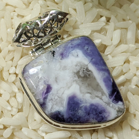 Sterling Silver Morado (Purple) Opal Pendant- JSSMOP01. Morado (purple) Opal is a unique variety of common opal (no flash) colored by the inclusion of purple fluorite. Morado opal is excellent for working with the Third Eye Chakra and connecting to higher knowledge. It is believed to bring the energy of the Pieione and the Pleiadians to you, to gain information about the true workings of our universe, to gain information in respect to energy transfer and energy balance, and to connect with the star people of the Pleiades. It resonates to the energies of the Violet Flame, those of purification and transformation. One is able to bring forth the energy of the Violet Flame into one’s being and thus into all of one’s energy fields, right down to the cellular level, dissolving and transmuting negative energies and bringing harmony to the whole of one’s being. It has also acted to increase the intensity of light which one perceives such that darkness is more filled with light. The Ascended Master St Germain, personally oversees the use of the violet flame, used by metaphysical and alchemical healers for transmutation of negative energies within the body. It intensifies the energetic connection between people. Purple opal is a symbol of royalty and luxury. 37mm x 24mm x 6mm