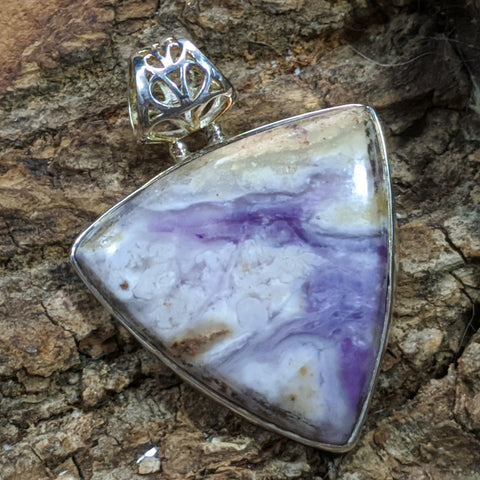 Sterling Silver Morado (Purple) Opal Pendant- JSSMOP01. Morado (purple) Opal is a unique variety of common opal (no flash) colored by the inclusion of purple fluorite. Morado opal is excellent for working with the Third Eye Chakra and connecting to higher knowledge. It is believed to bring the energy of the Pieione and the Pleiadians to you, to gain information about the true workings of our universe, to gain information in respect to energy transfer and energy balance, and to connect with the star people of the Pleiades. It resonates to the energies of the Violet Flame, those of purification and transformation. One is able to bring forth the energy of the Violet Flame into one’s being and thus into all of one’s energy fields, right down to the cellular level, dissolving and transmuting negative energies and bringing harmony to the whole of one’s being. It has also acted to increase the intensity of light which one perceives such that darkness is more filled with light. The Ascended Master St Germain, personally oversees the use of the violet flame, used by metaphysical and alchemical healers for transmutation of negative energies within the body. It intensifies the energetic connection between people. Purple opal is a symbol of royalty and luxury. 39mm x 30mm x 6mm