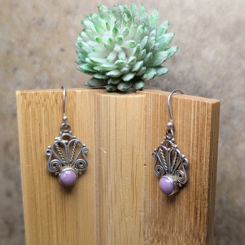 Sterling Silver Phosphosiderite (Strengite) Earrings-JSSSTREN. Phosphosiderite is a dimorph of Strengite, a iron rich member of the Variscite group. It can be used to activate both the hand and feet chakras in order to facilitate the alignment of meridians within the physical body. It has been useful in the acupressure/acupuncture techniques to produce an energy flow through, and a dissipation of, the energy blockages. It can be used to enhance the strength of the "silver cord" connection between the physical and astral bodies, assuring that one may always return "home". It provides for the alteration of the physical, mental, and emotional patterns, encouraging growth towards the highest level. It stimulates meditation during menial tasks and renews consciousness during every moment. It encourages honor, enhances reliability (even with respect to machinery) and discourages digression and diversion to past lessons. It is an excellent stone for those who feel “stressed out”, since the alignment with the Light body opens the channels through which one can release all internal disharmonies into the Light. It is cleansing to the auric field, and this can have the effect of precipitating cleansing of the physical body. It can bring about a strong activation and stabilization of the heart chakra. This not only generates positive emotional states, but also helps establish them as one’s normal way of being. Instead of seeing joy as a peak experience, it can become a way of life. As a stone of prosperity, it is strong and helpful in terms of helping one make sure there is always “enough”. It can be used to help unite disparate types of people through the common bonds of love. It can be used to help smooth relationships with others whom one finds difficult or who may hold beliefs wildly different from one’s own. It can also be used to heal one’s perception of ones self. 34mm x 16mm x 5mm.
