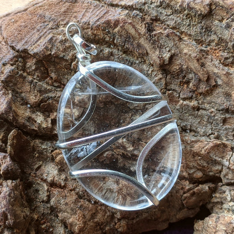 Tarnish-Free Silver Plated Copper Wire Wrapped Quartz Pendant~ JSPQTZP1. Quartz is an energy amplifier, providing power and clarity to the wearer. It is said to bring the energy of the stars into the soul. It is said to harmonize and align human energies. Quartz can be used to facilitate both speaking with, and receiving information from, the spiritual and other-worldly masters, teachers, and healers. It aids one in reaching and utilizing the talents and abilities of the mind. Quartz worn over the heart can help to clear emotional disturbances from ones being, and enhances self-acceptance and self-love. It also helps to purify the physical, emotional and spiritual bodies, and is a healer of negativity associated with ones perspectives and judgments. It aids one in directing ones energy to toward the spiritual realm, toward the light, love, and harmony of the planet, teaching one to live, laugh, and love with all brothers and sisters. One can "program" quartz with a prayer, making it a constant prayer generator, sending the message and energy of the prayer out into the heavens. The energy of quartz is asking you to clarify yourself so that the universe can provide you with the answers to your prayers. The message is that your are a reflection of the clarity of the Divine mind. Approx.. 54mm x 30mm x 10mm