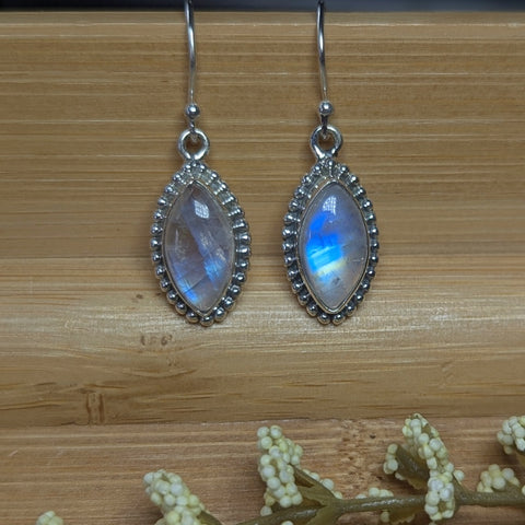 Sterling Silver Rainbow Moonstone Earrings~JSSMOON3. Rainbow Moonstone relates to "new beginnings, asks us to pay attention to the cycles in our life and to celebrate the milestones and rites of passage each new cycle brings, a stone for hoping and wishing, can assist one in understanding the destiny one has chosen, cleanses negativity from the chakras, can reveal to women their feminine power and their connection to goddess, it assists one in influencing the origination of personal & universal/ world-wide progress and improvement, brings the white light of healing, brings an orderliness to planning,, promotes intuition & contact with higher self. 35mm x 11mm x 6mm