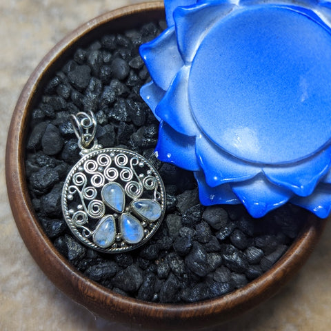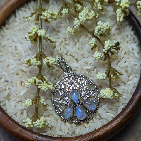 Sterling Silver Rainbow Moonstone~JSSRMP01. Rainbow Moonstone relates to "new beginnings, asks us to pay attention to the cycles in our life and to celebrate the milestones and rites of passage each new cycle brings, a stone for hoping and wishing, can assist one in understanding the destiny one has chosen, cleanses negativity from the chakras, can reveal to women their feminine power and their connection to goddess, it assists one in influencing the origination of personal & universal/ world-wide progress and improvement, brings the white light of healing, brings an orderliness to planning,, promotes intuition & contact with higher self. 41mm x 28mm x 8mm