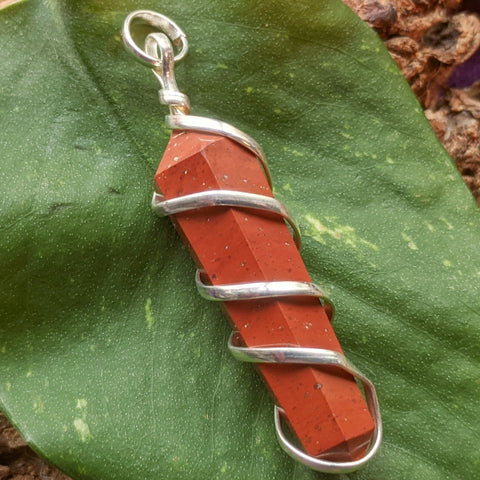 Tarnish-Free Silver Plated Copper Wire Wrapped Red Jasper Pendant~JSPWRRP2. Red Jasper carries a grounding, nurturing, protective energy. It is considered a “stone of the advocate”, it is said to promote justice, fairness, equality, replacing “just us” with “justice”. It is thought to bring stability to one’s aura and energy field, increasing one’s stamina. Approx. 53mm x 13mm x 12mm. .
