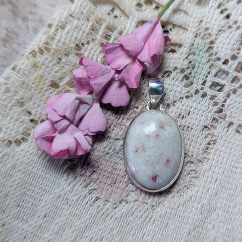 Sterling Silver Rosalinda Pendant~JSSRLP03. Rosalinda is the trade name for a stone from the coast of Peru comprised of a form of scapolite called Marialite (white), and a form of Epidote called Piemontite (pink). It is said to help to clear karmic debt. It is thought to help one deal with stress and clear out negativity. It is said that Rosalinda can clear and stimulate your High Heart Chakra (the chakra between ones heart and throat chakras), and that of anyone who enters your energy field (within approximately four feet). Encourages self-mastery. Can particularly aid the young in being courageous and self-reliant. 38mm x 20mm x 7mm
