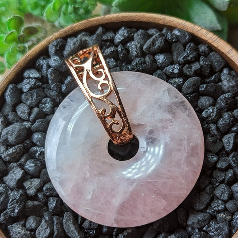 Large Rose Quartz Donut Pendant with Rose Gold colored Pendant~JRQDONP2. Rose quartz is said to emit a calming, cooling energy to gently remove negativity and to reinstate the loving, gentle forces of self-love. It brings clarity and harmony to the emotions and mind. It promotes gentleness from within, and attracts it from outside ourselves. Rose quartz also opens us up to the beauty of music, art, literature, nature, ourselves and others. It is an excellent stone for healing emotional wounds. Rose quartz reminds us that universal love is our birthright, and that the only lasting lesson is love, and that we have already learned it, and we need only open ourselves to its healing truth. It represents the Great Earth Mother, supporting us, calming excess fiery emotions, and allows us to connect with the Divine Source while here on Earth. The message of rose quartz is to remind one that only love can heal your life and your creations, that it is time to let go of any anger or resentments, and that there is nothing you can do that would make God love you any more, and there is nothing you could do that would make God love you any less. Say to yourself "I give love, I live love, I am love". 62mm x 50mm x 12mm
