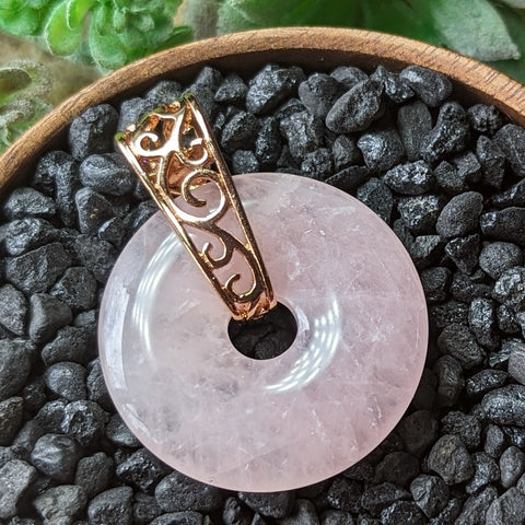 Small Rose Quartz Donut Pendant with Rose Gold colored Pendant~JRQDONP3. Rose quartz is said to emit a calming, cooling energy to gently remove negativity and to reinstate the loving, gentle forces of self-love. It brings clarity and harmony to the emotions and mind. It promotes gentleness from within, and attracts it from outside ourselves. Rose quartz also opens us up to the beauty of music, art, literature, nature, ourselves and others. It is an excellent stone for healing emotional wounds. Rose quartz reminds us that universal love is our birthright, and that the only lasting lesson is love, and that we have already learned it, and we need only open ourselves to its healing truth. It represents the Great Earth Mother, supporting us, calming excess fiery emotions, and allows us to connect with the Divine Source while here on Earth. The message of rose quartz is to remind one that only love can heal your life and your creations, that it is time to let go of any anger or resentments, and that there is nothing you can do that would make God love you any more, and there is nothing you could do that would make God love you any less. Say to yourself "I give love, I live love, I am love". 52mm x 40mm x 12mm