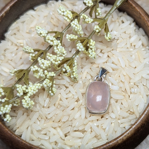 Rose Quartz Pendant~JSSROSEP. Rose quartz is said to emit a calming, cooling energy to gently remove negativity and to reinstate the loving, gentle forces of self-love. It brings clarity and harmony to the emotions and mind. It promotes gentleness from within, and attracts it from outside ourselves. Rose quartz also opens us up to the beauty of music, art, literature, nature, ourselves and others. It is an excellent stone for healing emotional wounds. Rose quartz reminds us that universal love is our birthright, and that the only lasting lesson is love, and that we have already learned it, and we need only open ourselves to its healing truth. It represents the Great Earth Mother, supporting us, calming excess fiery emotions, and allows us to connect with the Divine Source while here on Earth. The message of rose quartz is to remind one that only love can heal your life and your creations, that it is time to let go of any anger or resentments, and that there is nothing you can do that would make God love you any more, and there is nothing you could do that would make God love you any less. Say to yourself "I give love, I live love, I am love". 27mm x 12mm x 8mm
