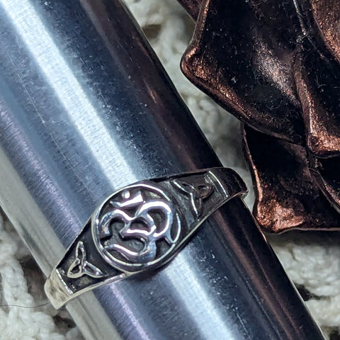Sterling Silver Sanskrit Om Ring Size 9~JSSR1SOM. Om, also written as Aum, is a mystical and sacred syllable that originated from Hinduism but is now common to Hinduism, Sikhism, Jainism, Buddhism and the Bön faith. "Om is the one eternal syllable of which all that exists is but the development. The past, the present, and the future are all included in this one sound, and all that exists beyond the three forms of time is also implied in it". Although Om symbolizes the most profound concepts of universal creation including the three stages of existence (birth, life and death), it is in use daily. The devout begin their day, work, prayers or a journey by uttering Om. Silver brings one "the advantage" throughout life. It is the metal of the Goddess, the Moon, and the female energy. It encourages inward reflection. It can be used to improve ones quality of speech and can bring eloquence to conversations. It can be used as a mirror to the soul, stimulating seeing oneself from outside of the body. It provides one with patience and perseverance in the tasks chosen and in understanding the underlying reasons for the tasks. It connects one to the female, the Goddess polarity. It aids in exploring the deep inner realms of emotion and intuition. It can help open the psychic senses and hone one’s empathic abilities. It acts as a doorway to the subconscious, unconscious, and nether realms. It assists one in connecting with the mysteries, and perceiving the truth behind surface appearances. The message of silver is "I go within to find the Light of the hidden truth, and I bring it back to share”.
