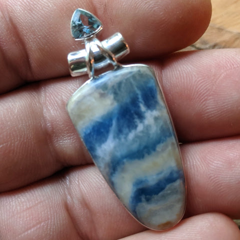 Sterling Silver Blue Scheelite & Blue Topaz Pendant-Turkey~JSCHEEL4. Scheelite represents the coming together of humanity, with all of its diversity. It is extending the flame of one candle to light the next. It represents clarity of intention, connection and community. It is helpful to have in ones energy field to maintain a tranquil, calming energy that will help to feel safe and secure, no matter what the circumstance. For those who are facing inconsolable fears (personal issues, the direction of current events, natural earth based events, etc.) Blue Scheelite will soothe and comfort your fears and any uncertainty. It can also help to ease anxiety, panic and PTSD issues. It is a wonderful supportive companion to those facing addiction and recovery as well. It can remove creative blocks. It enhances connected thought patterns, assisting one in punctuality and in meeting deadlines. It provides for insight into the discovery of “a map to the heavens”, allowing one to pre-determine the destination prior to, or during, astral travel. Blue Topaz is a stone of true love and success in all endeavors, can provide confidence in trusting ones decisions, It acts to replace negativity with love and joyfulness. It is quite helpful in visualization( for healing and or attracting), in meditation, and in projection. It can stimulate the throat chakra such that one may consciously, succinctly, and clearly verbalize that which one desires to manifest and/or that which one desires to communicate. 50mm x 21mm x 8mm.