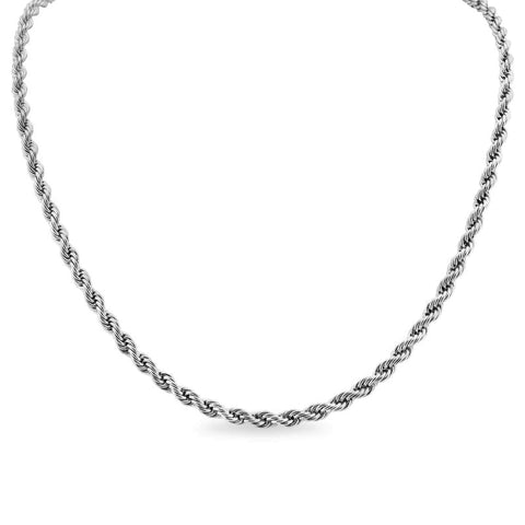 Thirty (30) Inch Stainless Steel Rope Chain~JSTST30R. Introducing the stunning Stainless Steel Rope Chain Necklace! Make a strong fashion statement with this necklace that features an elegantly woven silver rope chain design with a lobster-claw clasp that ensures a secure fit for everyday wear. It's the perfect accessory for any outfit, whether you're dressing up or dressing down, and looks even better when accented with your favorite pendant or layered with other necklaces for a stacked appearance. So treat yourself or gift to a friend but don't miss out - grab this striking necklace today! The Stainless Steel Rope Chain Necklace is strong, durable, and doesn't easily break. 316L Surgical Grade Stainless Steel will never fade, tarnish or turn skin green, even when worn in the ocean or pool. All Stainless Steel Rope Chain Necklaces are Hypoallergenic. A great alternative to .925 Sterling Silver. 3mm thick.