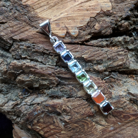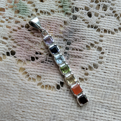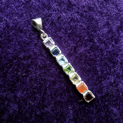 Sterling Silver Chakra Pendant- JCHAKRA2 53mm x 6mm x 4mm. Garnet, Carnelian, Citrine, Peridot, Blue Topaz, Iolite, Amethyst. Stone size 5mm each.