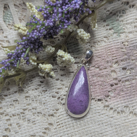 Sterling Silver Stichtite Pendant~JSSSTIC7. Stichtite is a stone of forgiveness, and in forgiving we free ourselves to be gentle with ourselves and others, promoting calm, peaceful, gentle, compassionate speech and inner dialog. This can be useful in countering the angry divisiveness that is so prevalent in our world today. 37mm x 13mm x 6mm