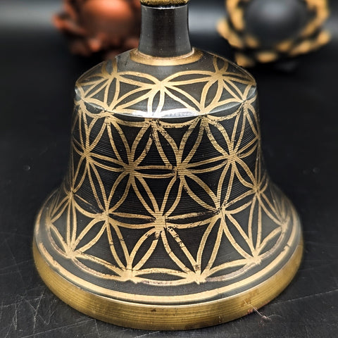 Brass Flower of Life Meditation Bell~SHBFBELL. The toning effect of this Brass Meditation Bell can be used to assist meditation, in clearing ones space to remove unwanted, lingering negative energies, in opening and closing ceremonies of spiritual groups, in sound healing, in clearing and programming of crystals and in music. The Flower of Life is the modern name given to a geometrical figure composed of multiple evenly-spaced, overlapping circles, that are arranged so that they form a flower-like pattern with a sixfold symmetry like a hexagon. The center of each circle is on the circumference of six surrounding circles of the same diameter. It is considered by some to be a symbol of sacred geometry, said to contain ancient, religious value depicting the fundamental forms of space and time. In this sense, it is a visual expression of the connections life weaves through all sentient beings, believed to contain a type of Akashic Record of basic information of all living things. The Bell (ghanta)along with the visual icon of the vajra club (Dorje), form a principal symbol of the Vajrayana Buddhism of Tibet. 160mm x 91mm.
