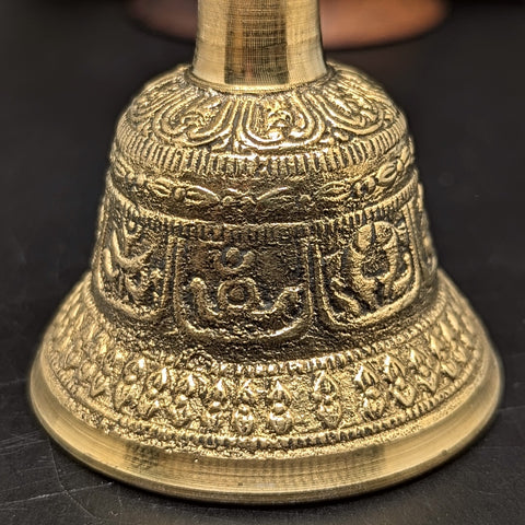 8 Auspicious Symbols Brass Meditation Bell~SHBMBELL. The toning effect of this Brass Meditation Bell can be used to assist meditation, in clearing ones space to remove unwanted, lingering negative energies, in opening and closing ceremonies of spiritual groups, in sound healing, in clearing and programming of crystals and in music. The Eight Auspicious Symbols are 1. The Right-coiled White Conch Shell (call to awakening), 2. The Precious Parasol (protection), 3. Victory Banner (represents the victory of the Buddha’s teachings over death, ignorance, disharmony and negativity), 4. Golden Fishes (happiness and fearlessness), 5. Dharma Wheel (Noble Eightfold Path), 6. Endless Knot (Inter-connectedness, karma, infinite wisdom), 7. Lotus Flower (purififcation of body, speech, mind) 8. Treasure Vase (long life, wealth, prosperity)The Bell (ghanta)along with the visual icon of the vajra club (Dorje), form a principal symbol of the Vajrayana Buddhism of Tibet. 168mm x 92mm.Link for Vajra (Dorje)