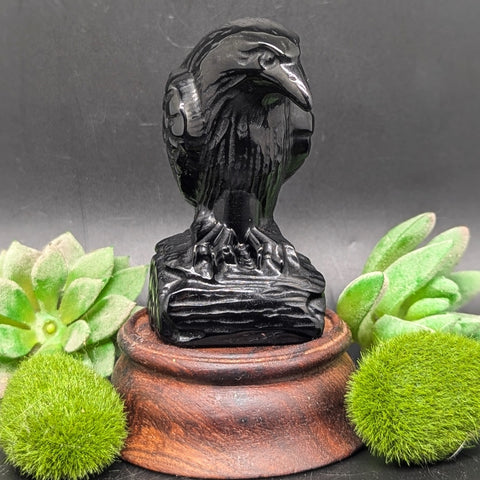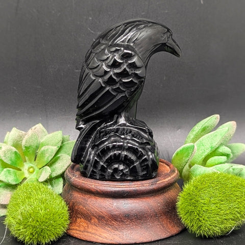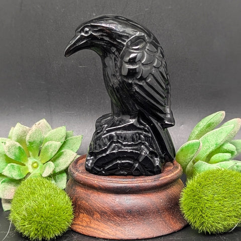 Black Obsidian Raven Carving~CRORAVEN. Some Native American tribes link the Raven deity with the theft of the sun. As per animal totems, which hold great importance in the Native American culture, raven totem symbolizes a change in consciousness and also represents a shapeshifter. Native elders believed that the raven had the power to draw secrets from the Shadows. Raven is a bearer of magic. It is the messenger from the great void beyond time, space, and ether, from where ‘everything originated’ and into which everything eventually goes. The raven was sacred to Native American ceremonies. It always had to be present to transport the energy of the message to its destiny. The raven’s powers also healed people from a distance. Obsidian is a natural volcanic glass, formed when lava solidifies so quickly that mineral crystals do not have time to grow. It is said to act to cleanse the energetic field or aura of disharmonious energy, densities, and negative attachments. It is thought to be very grounding and protective and also assist one in choosing behaviors that are only for one's highest good. Obsidian has also been used for scrying, or crystal gazing. A strongly protective stone, Obsidian forms a shield against negativity, providing a grounding cord from the base chakra to the center of the earth. It absorbs negative energy from the environments and blocks psychic attack and negative spiritual influences. Obsidian brings clarity to the mind and clears confusion. Providing deep soul healing, Obsidian goes back to past lives to heal festering emotions or trauma carried forward into the present, bringing depth and clarity to emotions. 85mmm x 6mm x 46mm