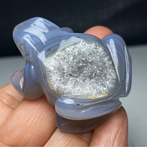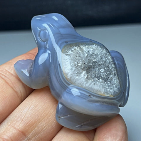 Blue Lace Agate Frog Carving~CRBLAFRG. Blue Lace Agate is considered an ally for those who were taught to be "seen and not heard", to "speak up", to know when to speak or not, and to monitor our internal dialog. It is the stone for anyone speaks in public, assisting in finding the words and manner of delivery to convey one's thoughts and ideas. It reminds us that our words shape our reality-energetically it is the equivalent of NLP (Neuro-Linguistic Programming). It has a lower intensity and vibrates to a slower frequency than other stones, and so is highly regarded as a stabilizing and strengthening influence. Agate is excellent for balancing emotional, physical and intellectual energy, and in harmonizing yin and yang, the positive and negative forces of the universe. Agate is said to promote inner stability, composure, and maturity. Its warm, protective properties encourage security and self-confidence. Agate is thought to enhance creativity and strengthen the intellect, making it a beneficial stone for both students and artists. Emotionally, agate is considered a stone of courage, emotional strength, self-confidence, and dispels fears. 51mm x 45mm x 21mm.