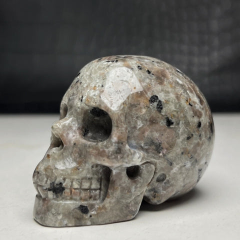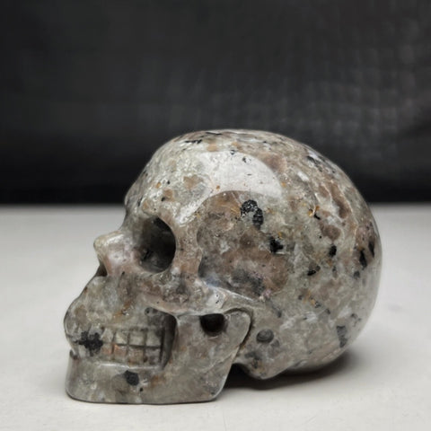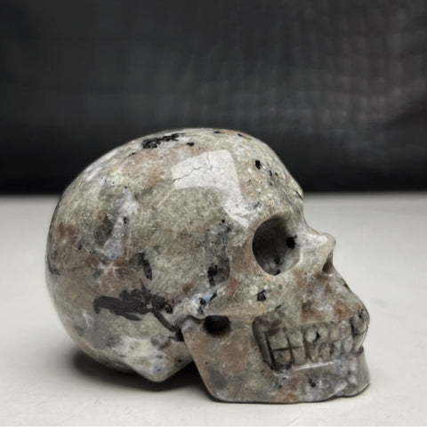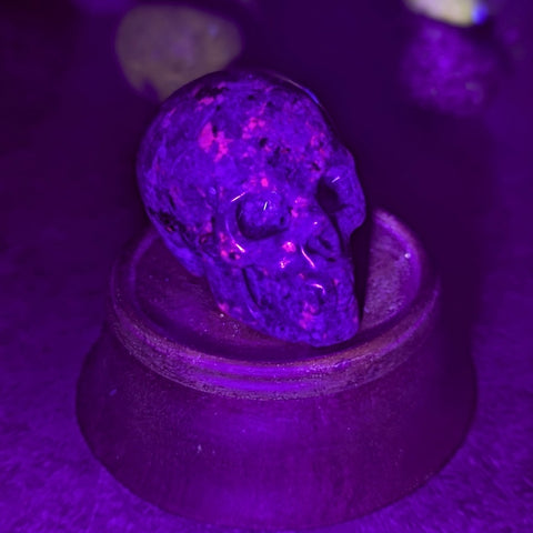 Emberlite Skull~CRESKULL. Emberlite is considered a stone of "tough love”, connects the heart with sane, sound, logical reasoning & decision making, encourages being true to self & standing up for your beliefs, helps to eliminate confusion, & to make one adaptable to each situation, excellent stone for use in groups; it provides for fellowship, solidarity, & a commonality of goal and purpose, facilitates the manifestation of the qualities of companionship & mutual dependence, encouraging self-esteem, self trust & trust in others, can be used to enhance truthfulness in emotions, allowing one to both recognize & verbalize the true feelings, can provide one with access to the sacred laws of the universe, stimulates the Pineal Gland & the Third Eye, & deepens meditation, an aid to those studying symbolism & its role in the greater scheme, by helping one to become aware of the patterns that can occur over the course of one's life, & their meanings and purposes. Instead of representing death or loss, Skulls represents the important Buddhist concept of emptiness. In Buddhism, emptiness is considered to be a quality of the universe. This means that phenomena we experience has no inherent nature by itself; instead, we attach meaning to what we experience. It’s basically saying all events are neutral- but we choose to magnify them in our minds. They can also symbolize humility, reminding us that everything outside the skull is vanity. They can also represent humanity, unity, and diversity, because other than subtle differences and size, they are pretty much identical regardless, of age, sex, or race. Fluoresces under UV light. 52mm x 39mm x 35mm.